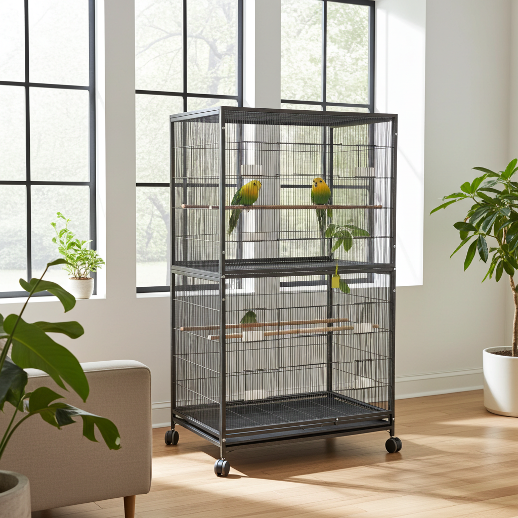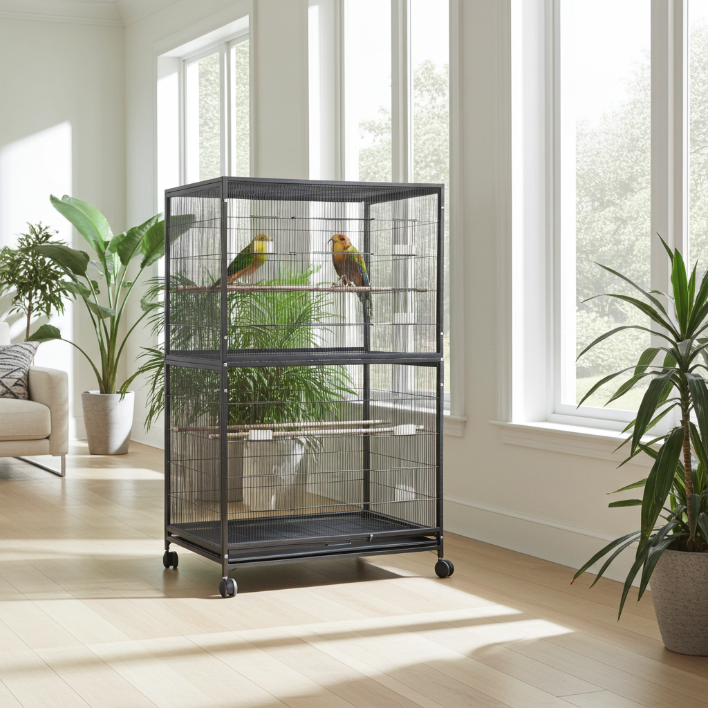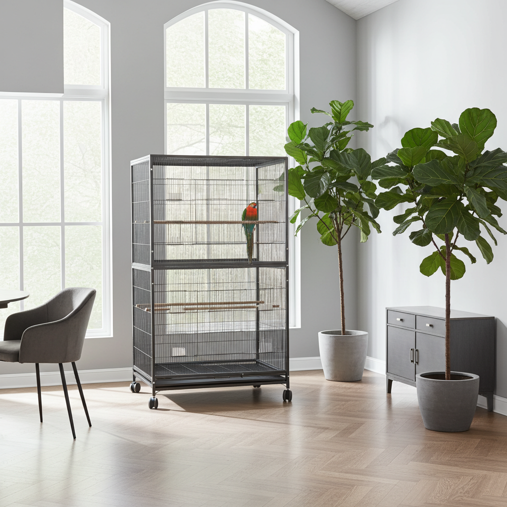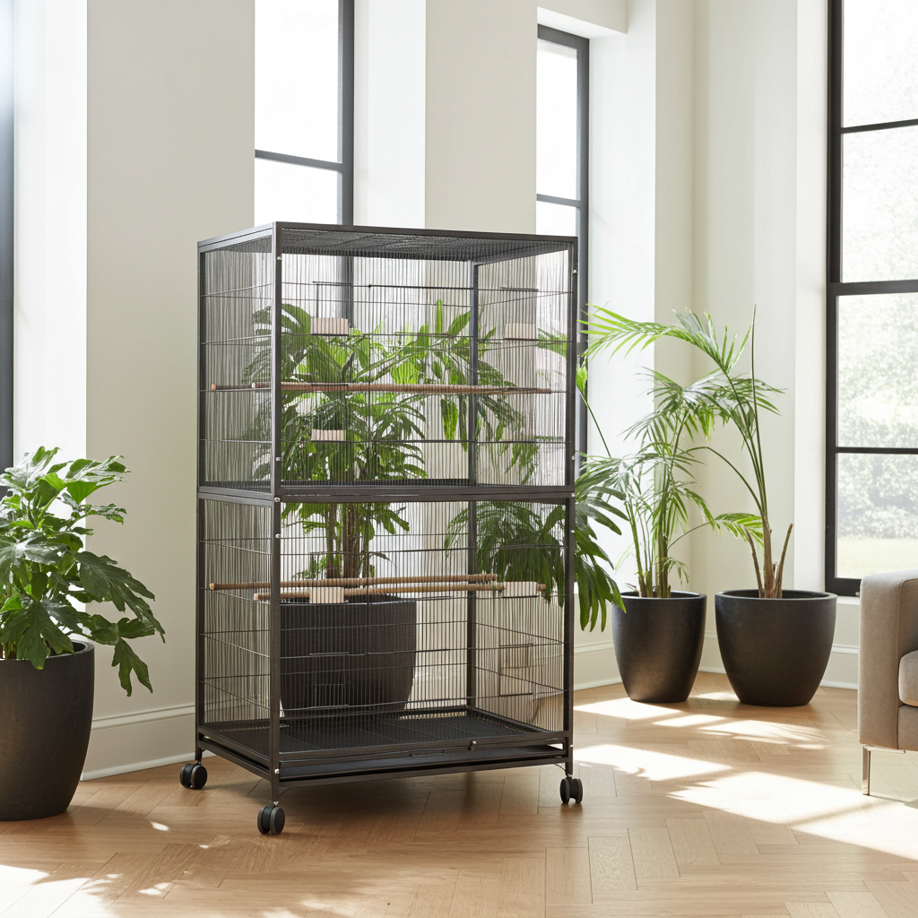 The stable wheeled platform, enhanced by the unique angled leg design, provides exceptional stability and smooth mobility. A deep slide-out tray accommodates substantial substrate layers for superior hygiene control. The Aviary represents the pinnacle of home bird accommodation for those refusing to compromise on space or quality.