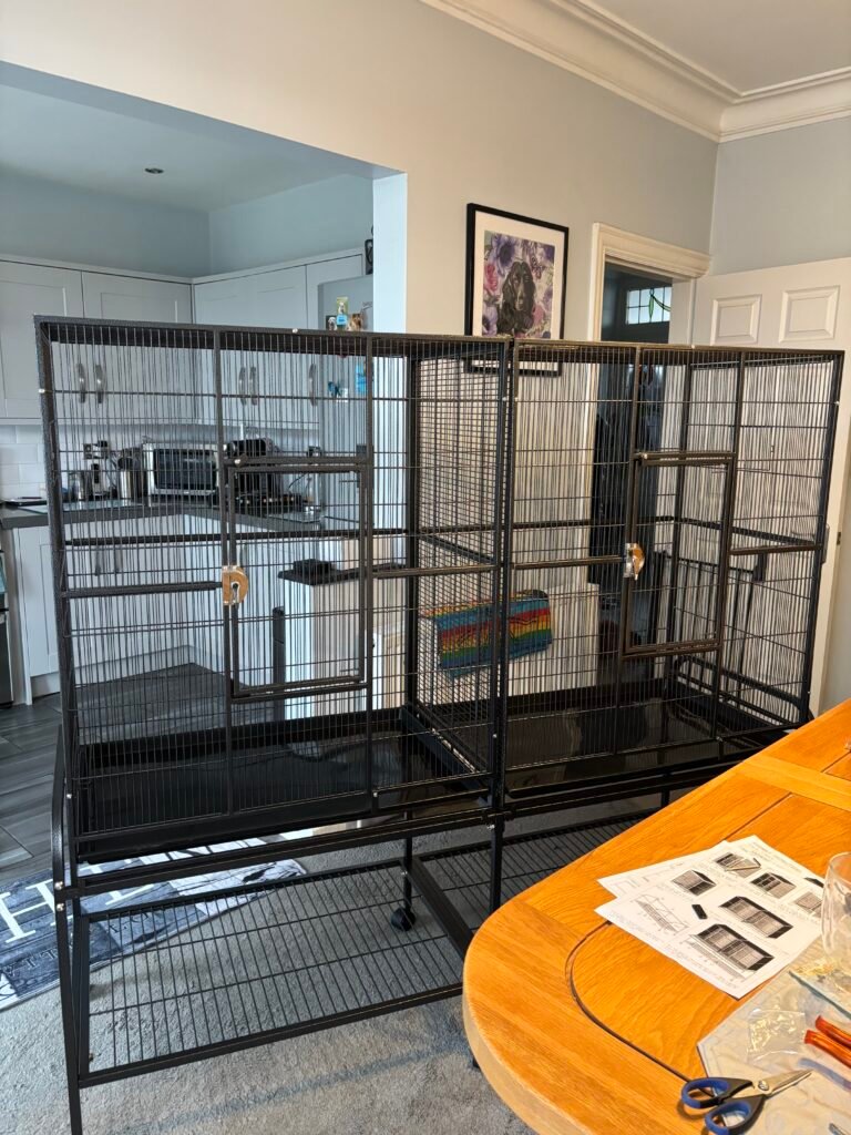 6. Cage arrived in 2 large boxes no damage at all . The cages were very easy to assemble with clear instructions and took approximately 1 hour to assemble stand and cages . Absolutely perfect for birds to move around and fly freely. If your looking for a cage that’s strong and secure for your birds then this cage is what you need.