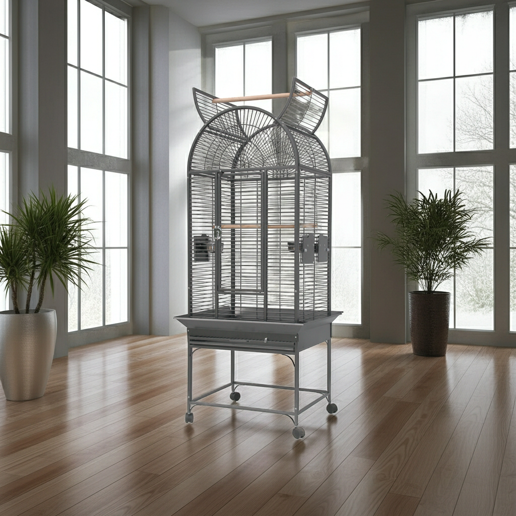 The Monarch showcases a breathtaking ornamental crown top with sweeping butterfly-wing accents and elaborate fan-shaped detailing, creating a truly regal centrepiece for any home. Standing 175cm tall in sophisticated charcoal grey, this cage’s powder-coated metal frame with 18mm bar spacing and 4mm wire diameter ensures both durability and elegance. Its distinctive decorative crown and curved ear extensions elevate bird housing to an art form, while the spacious 66×56cm interior provides generous accommodation for budgies, cockatiels, and small parrots.