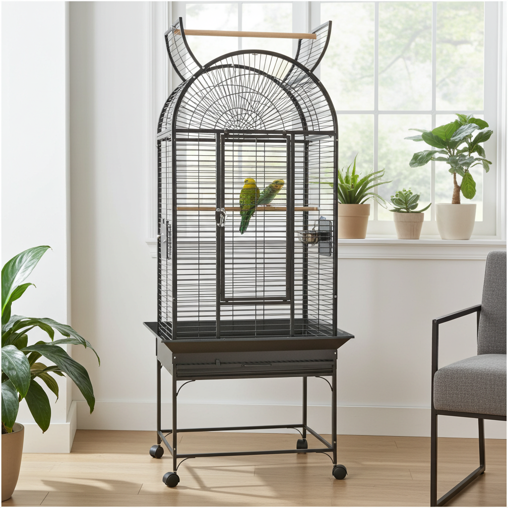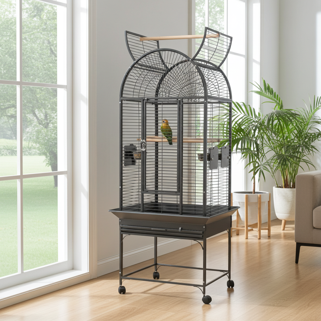 Inside, two natural wooden perches and three 5″ stainless steel cups are included, offering comfort and convenience for your feathered friends, along with ample room for additional enrichment accessories. Dual front-access doors with secure locking mechanisms ensure safe handling, and the deep, removable metal tray simplifies daily maintenance. The sturdy wheeled stand allows effortless mobility throughout your home, making it as practical as it is luxurious.