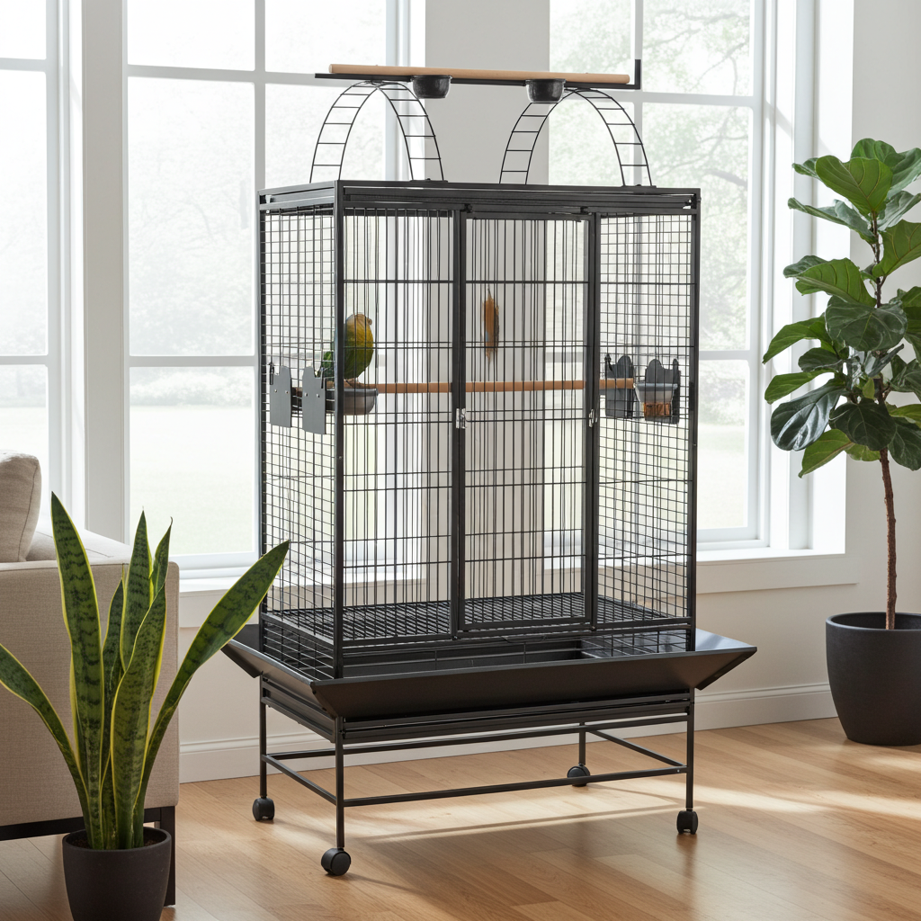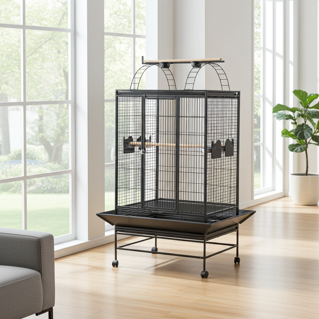 The Pavilion commands attention with its palatial proportions, offering an expansive 91×66cm interior that approaches flight cage dimensions within an impressive 175cm tall structure. This premium cage delivers mansion-like accommodation for larger parrots, active conure pairs, or substantial budgie colonies. Its heavy-duty powder-coated metal frame with 21mm bar spacing and 3.5mm wire diameter ensures strength, safety, and lasting elegance.