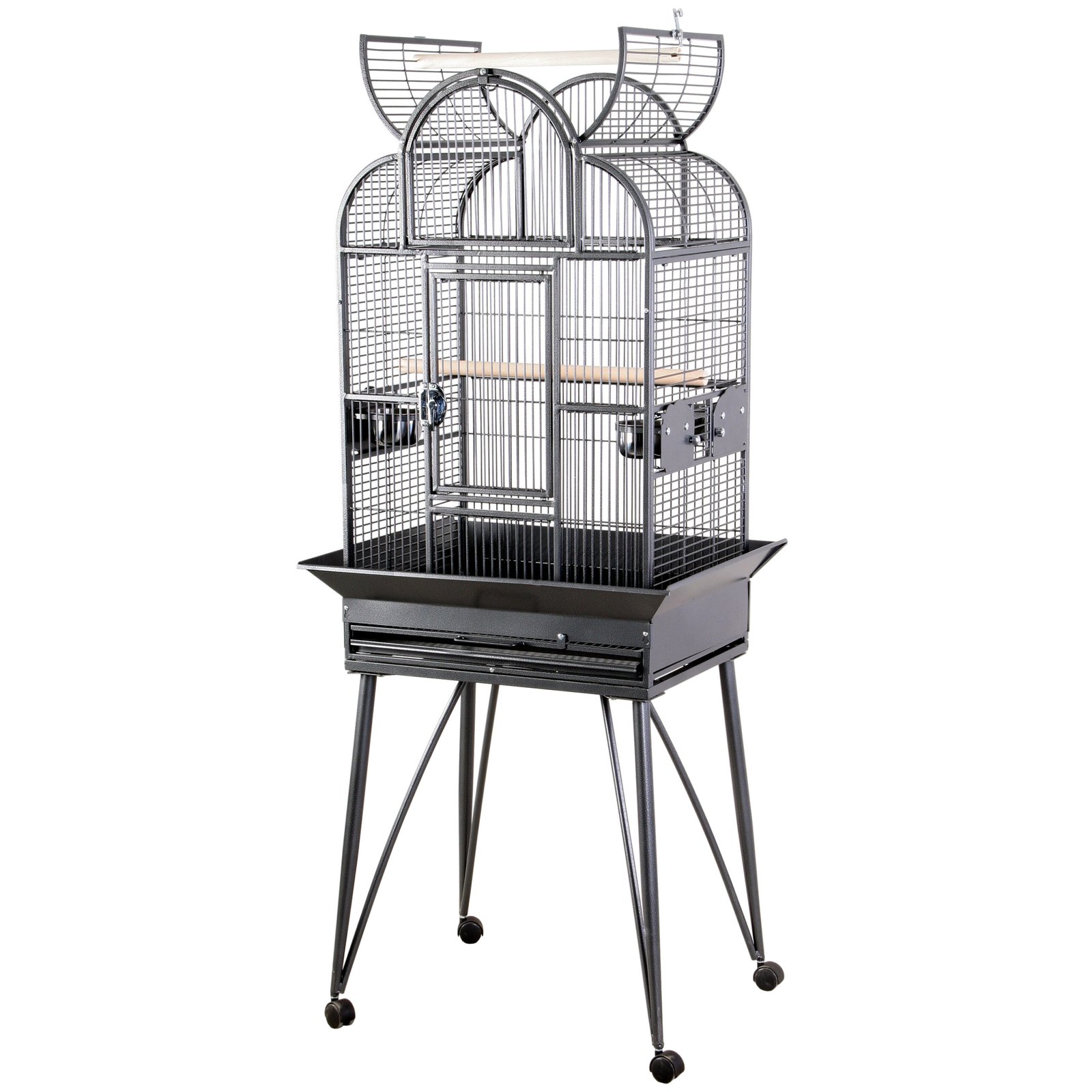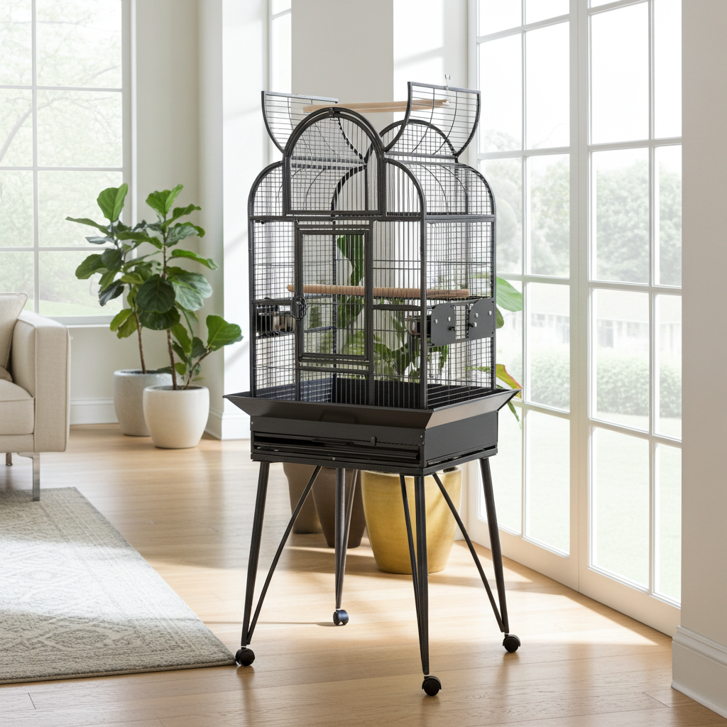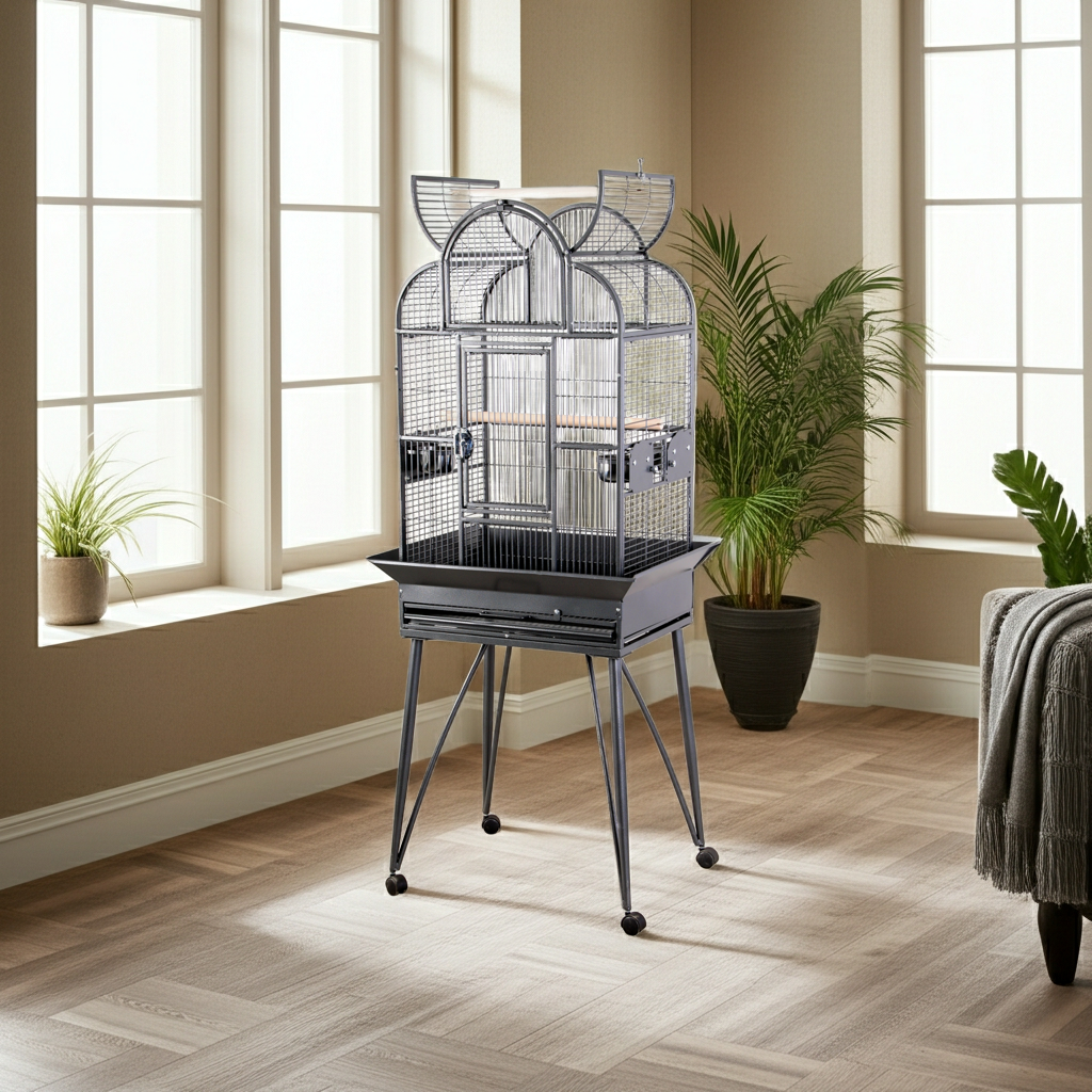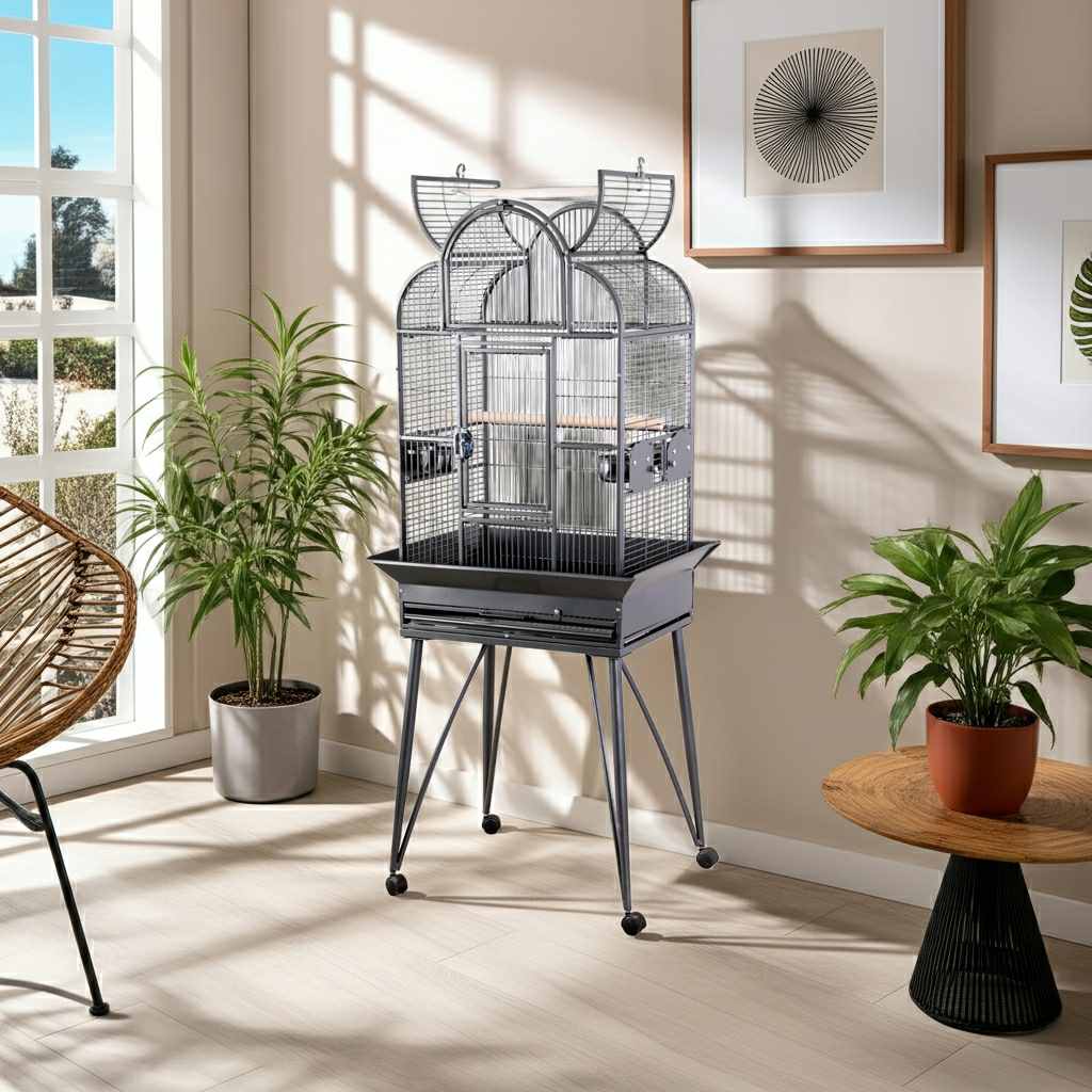 The space-efficient vertical architecture provides generous accommodation for budgies, canaries, finches, or cockatiels, with multiple levels for perching and playing. Two natural wooden perches and three 4″ stainless steel cups are included, offering comfort and convenience, while horizontal wire construction encourages natural climbing behaviours and maintains excellent visibility throughout. The charcoal grey finish adds modern sophistication, and mobile castors allow for easy repositioning. The slide-out tray system makes daily cleaning effortless.