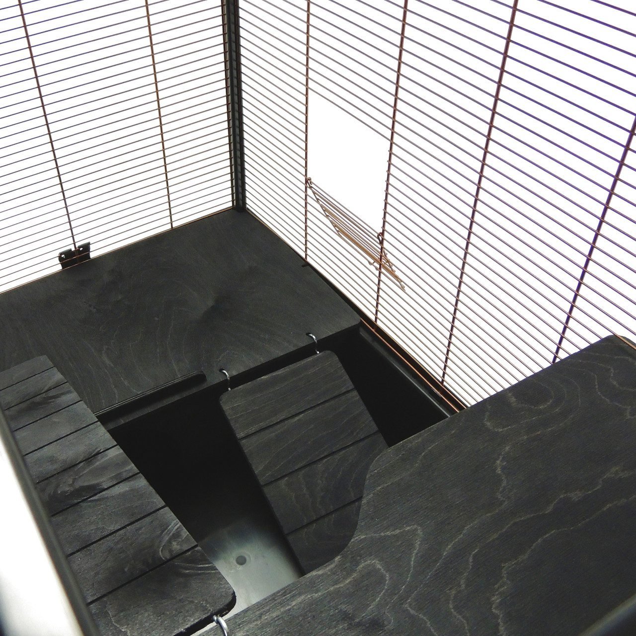 1. We bought this cage as a backup for our two rescue rats. It’s tricky to assemble and flimsy once set up. The top corner brackets get lost as they detach. They immediately peed down the side of it and it stained at the back. It’s sub ideal to hang hammocks from the back grating and the wood in it gets quite stained and wet and is harder to clean than metal with substrate. The shelf on the lower part is too narrow for our big boys who are now 5 and this is their b cage for when we need to move them. but they do love to nest inside it. I would not recommend it for its construction. There are other cages of similar size that are better. The